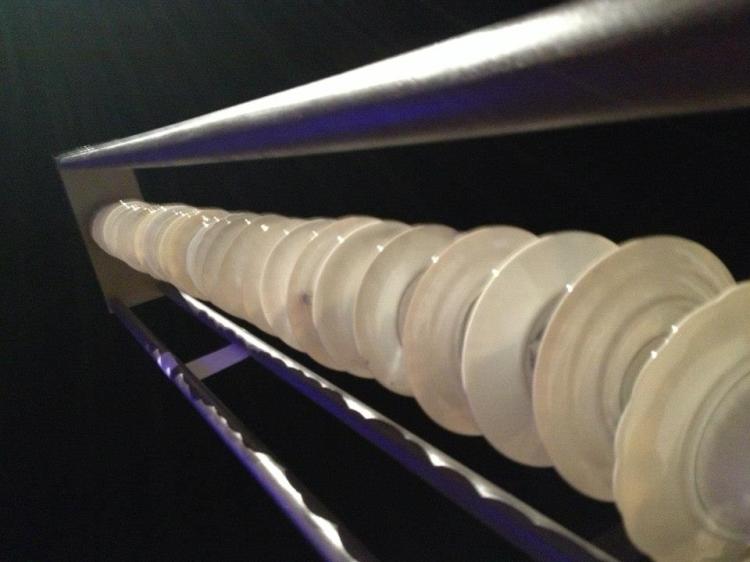 A kind of backbone made out of porcelain coffee cups, wiggles and clicks and makes small sounds. It is an everyday sound, something we may sometimes take for granted. The work Anna Kristina is named after my grandmother, and represents the strength required to be sensitive, and the power that lies in an inherent caring.