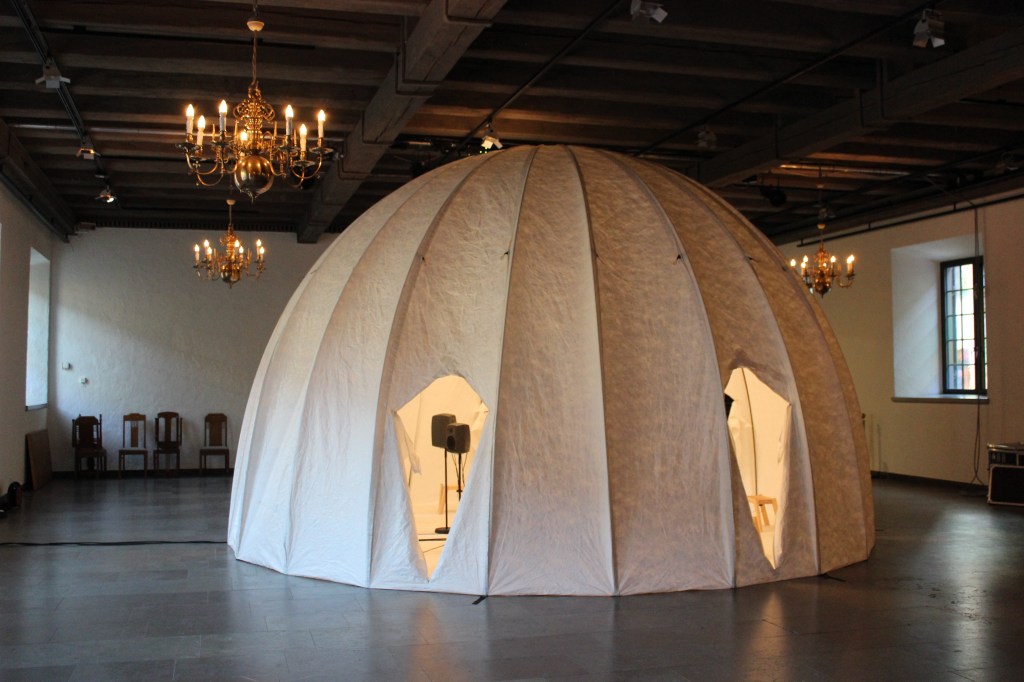 The installation consists of a tent, seven speakers standing in one circle formation and seven seating objects located in front of each of the speakers. Each speaker plays sine tones in frequencies that match one of the seven chakras. The seating objects are equipped with a transducer (speaker element) that causes the seat objects to vibrate at the same frequency as the tone you hear from the speaker. The vibrations resonate through the body, which means that you ”hear” with your body.