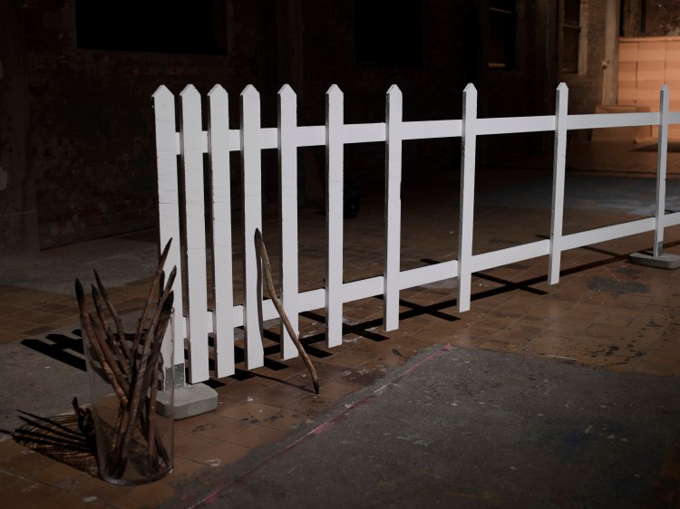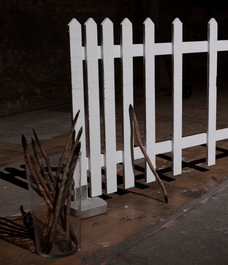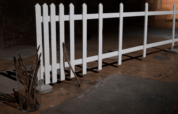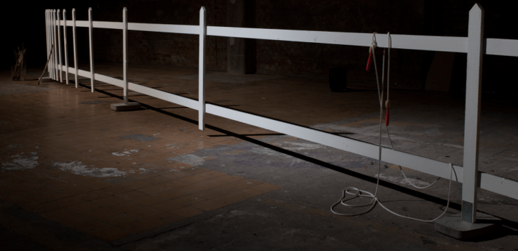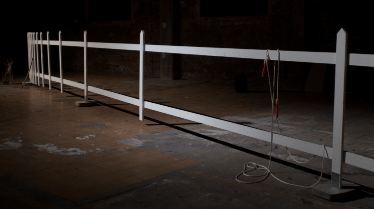 The installation consists of a twelve meter long white picket fence where the fence gradually becomes sparse so that part of it mostly consists of large holes. You are offered a blackened stick and when you drag the stick over the white fence pins you leave a mark, the sound gives a sense of time shifts. On one end of the fence a rope is firmly tied and lies abandoned on the ground. You can hear a recording of someone skipping rope.