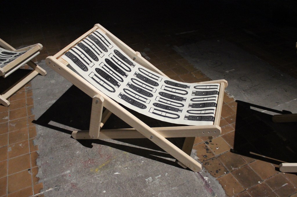 The deckchairs are built at Röda Sten by my friends, family and myself. The fabric is printed in Valands screen printing workshop with the supervision of Börje Almquist.